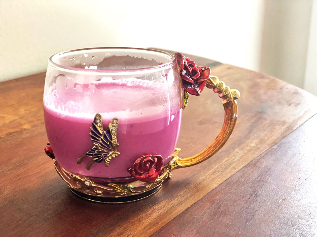 Almond milk pink Pitaya latte with Tasteless protein and it is delicious on this chilly Geelong Morning!! I am cutting back on my caffeine (not giving up just scaling back) and decided to make this recipe that one of my older sons adapted for our youngest! This was made as follows!